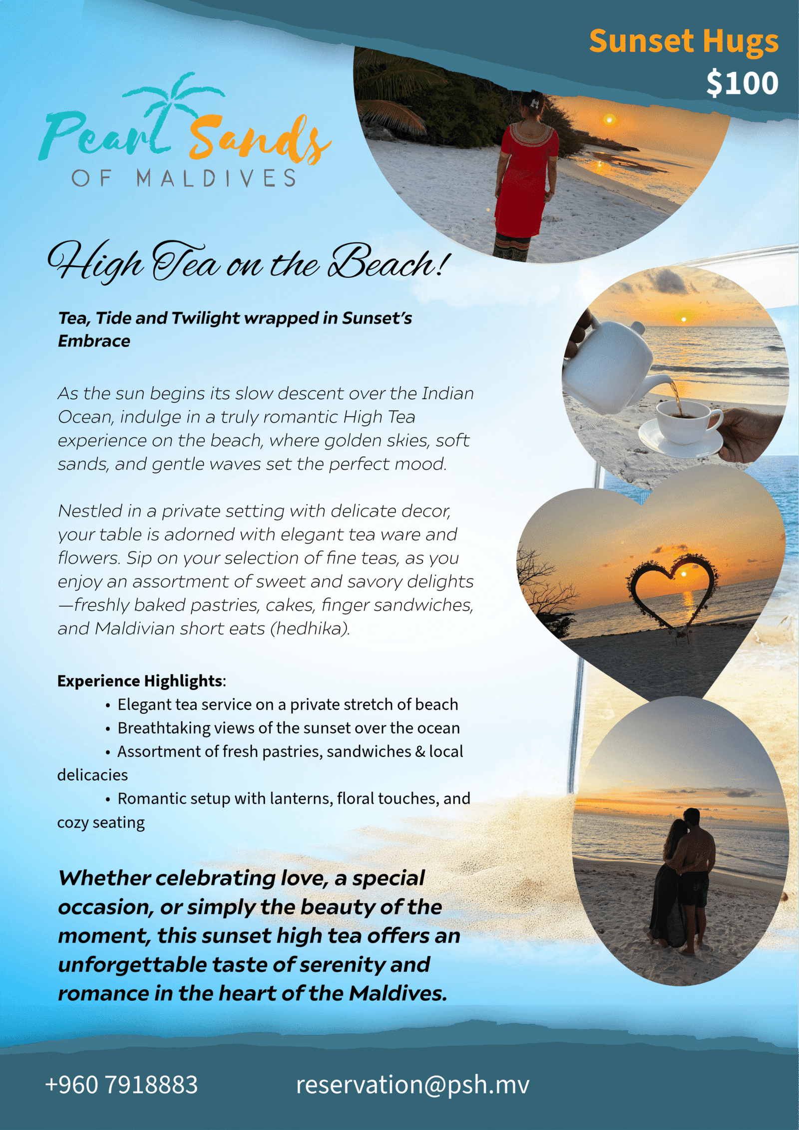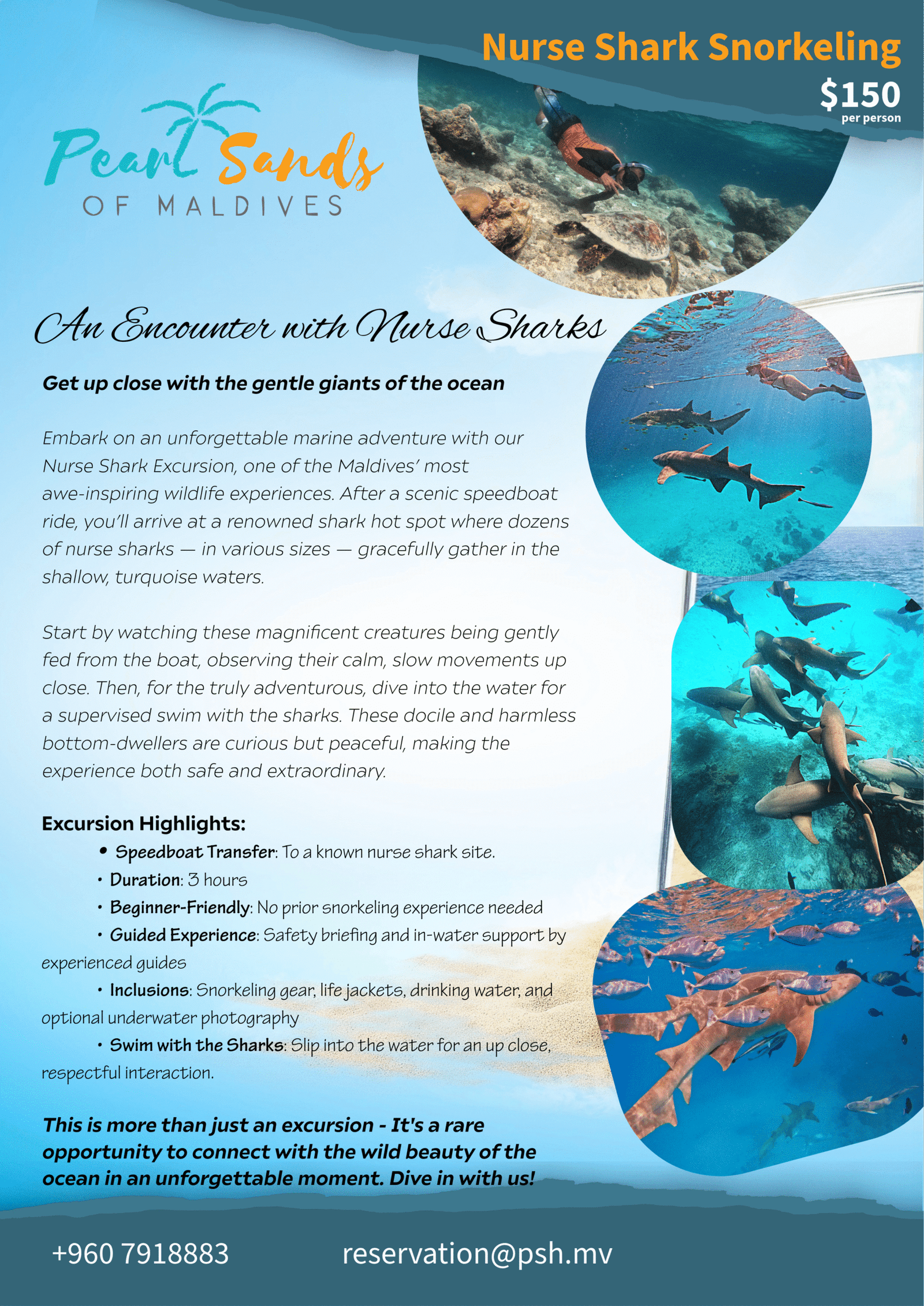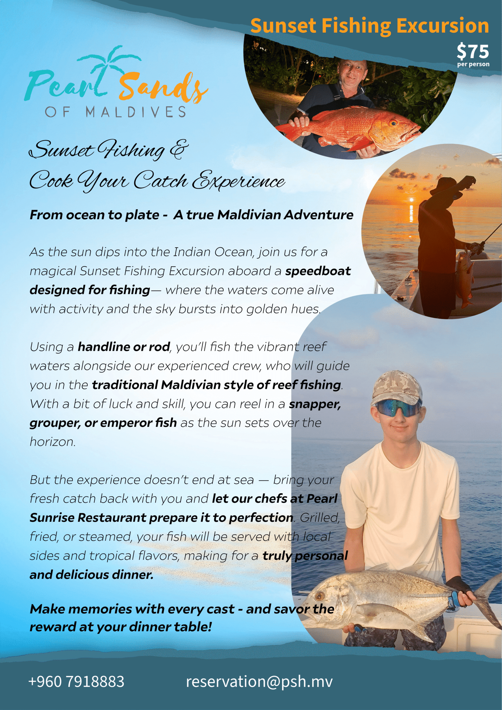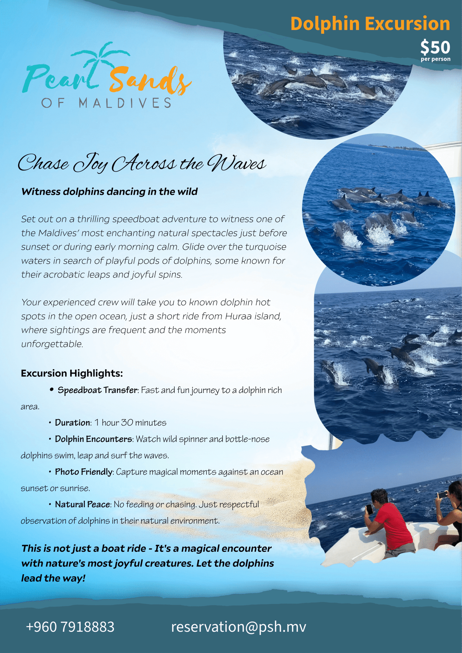Excursions & Activities Embark on an aquatic adventure! Join our array of excursions, watersports and other engaging activities! Go for a diver to explore the wonders of the sea!Our expert teams ensure a safe and memorable experience for you! Lunch at Sea For 2 pax $180 Romantic Dinner For 2 pax $180 Sunset Hugs High Tea For 2 pax $100 Bonfire $40 Romantic Bed Decor $40 Turtle Snorkeling Per Person $40 Fish Factory Snorkeling Per Person $100 Nurse Shark Snorkeling Per Person $150 Dolphin Excursion Per Person $50 Crab Hunting Excursion Per Person $40 Sand Bank Excursion Per Person $100 Coral Garden Snorkeling Per Person $100 Sunset Fishing Per Person $75 Male’ excursion Per Person $60 Lobster Picnic Excursion Per Person $129 Parasailing 15 minutes flight Per Person $99 Funtube 10 minutes Per Person $25 Jet Ski 30 minutes Per Person $60 Surfing 2 hours Per Person $60 Paddle Boarding 1 hour Per Person $25 Wakeboarding 15 minutes ride Per Person 30 minutes lessonPer Person $35 $60 Kayak 1 hours (single)Per Person 1 hour (double)2 pax $10 $15 Big Game Fishing 2 hoursPer Boat 4 hoursPer Boat $359 $659