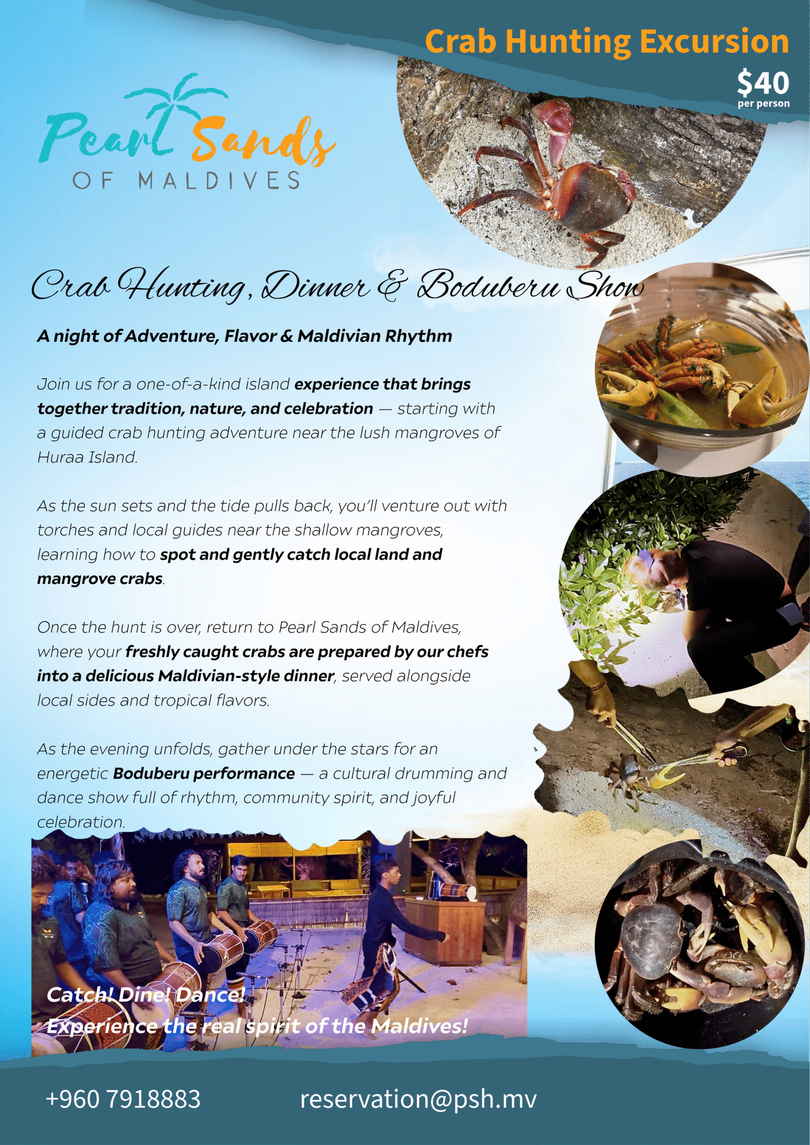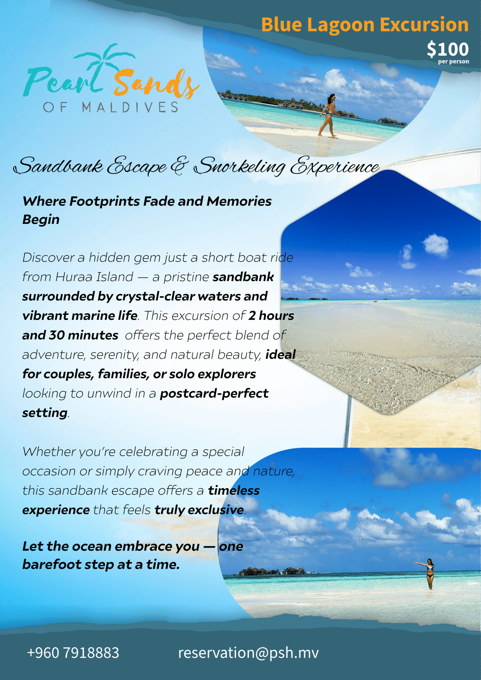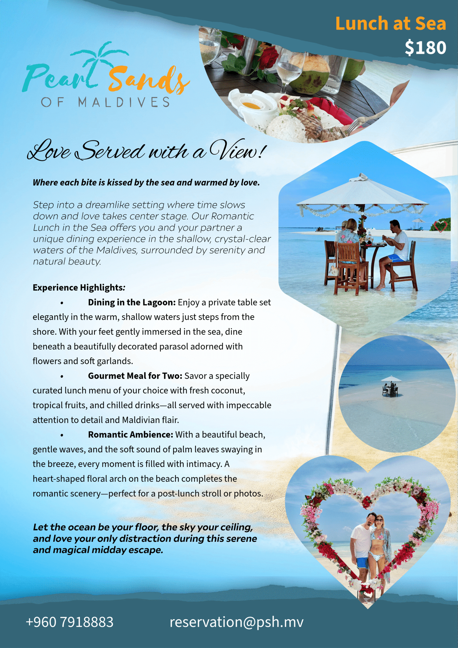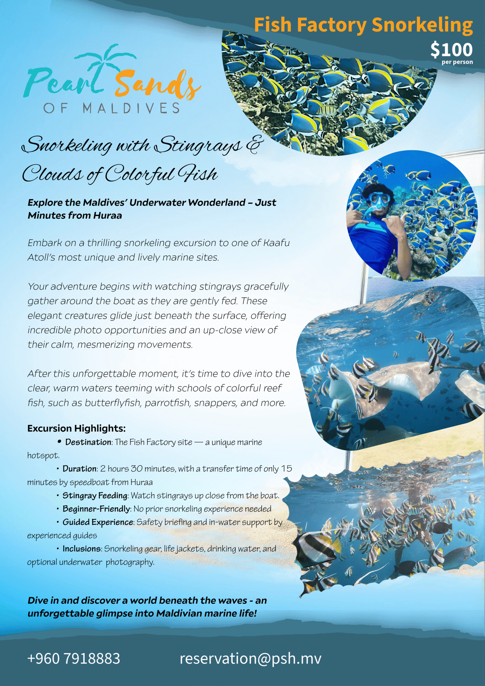 Excursions & Activities Embark on an aquatic adventure! Join our array of excursions, watersports and other engaging activities! Go for a diver to explore the wonders of the sea!Our expert teams ensure a safe and memorable experience for you! Lunch at Sea For 2 pax $180 Romantic Dinner For 2 pax $180 Sunset Hugs High Tea For 2 pax $100 Bonfire $40 Romantic Bed Decor $40 Turtle Snorkeling Per Person $40 Fish Factory Snorkeling Per Person $100 Nurse Shark Snorkeling Per Person $150 Dolphin Excursion Per Person $50 Crab Hunting Excursion Per Person $40 Sand Bank Excursion Per Person $100 Coral Garden Snorkeling Per Person $100 Sunset Fishing Per Person $75 Male’ excursion Per Person $60 Lobster Picnic Excursion Per Person $129 Parasailing 15 minutes flight Per Person $99 Funtube 10 minutes Per Person $25 Jet Ski 30 minutes Per Person $60 Surfing 2 hours Per Person $60 Paddle Boarding 1 hour Per Person $25 Wakeboarding 15 minutes ride Per Person 30 minutes lessonPer Person $35 $60 Kayak 1 hours (single)Per Person 1 hour (double)2 pax $10 $15 Big Game Fishing 2 hoursPer Boat 4 hoursPer Boat $359 $659
