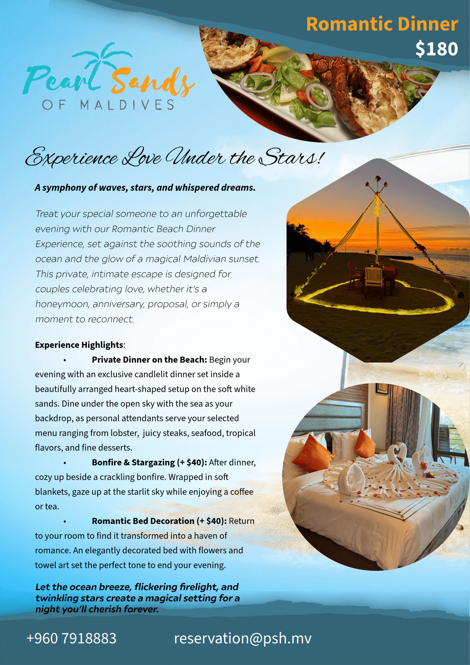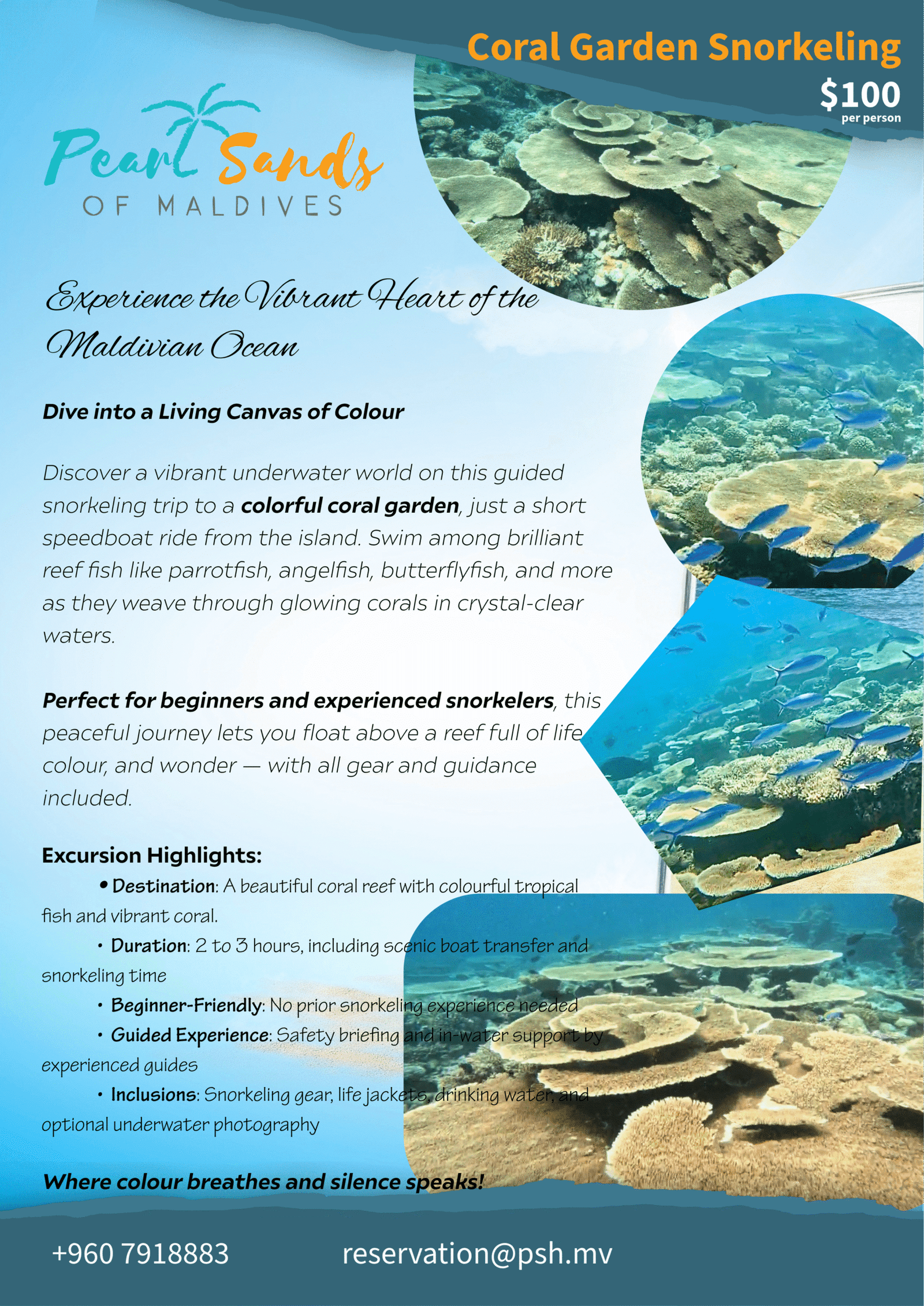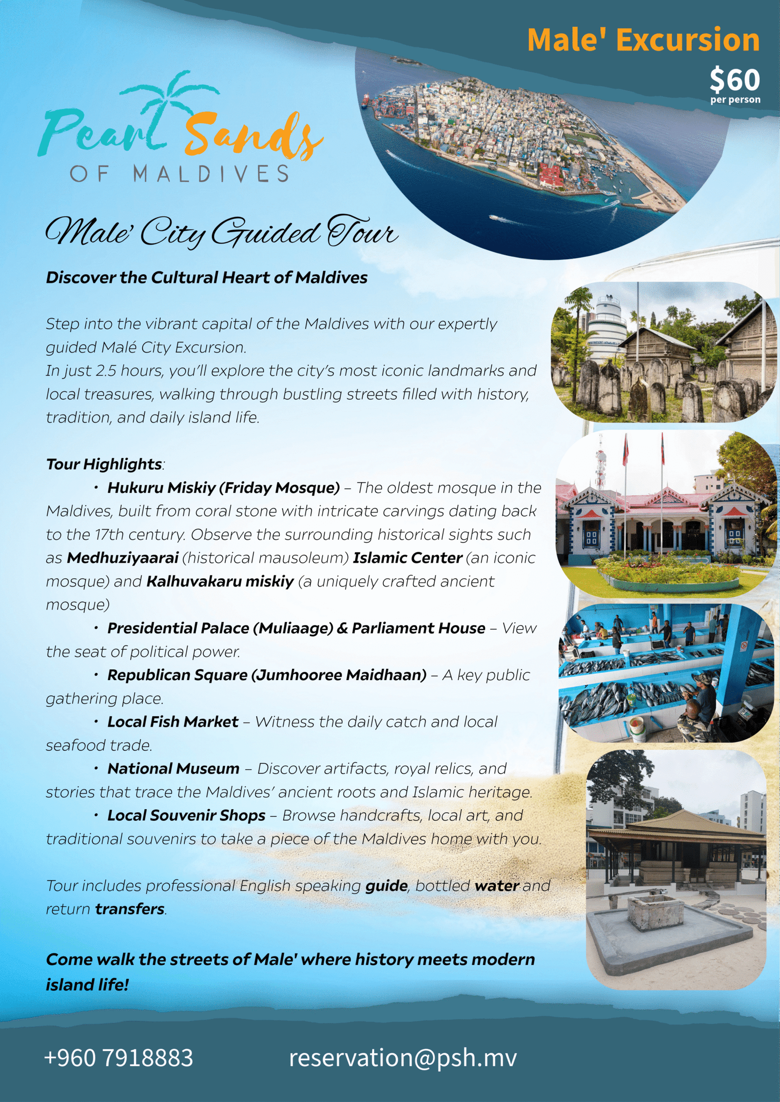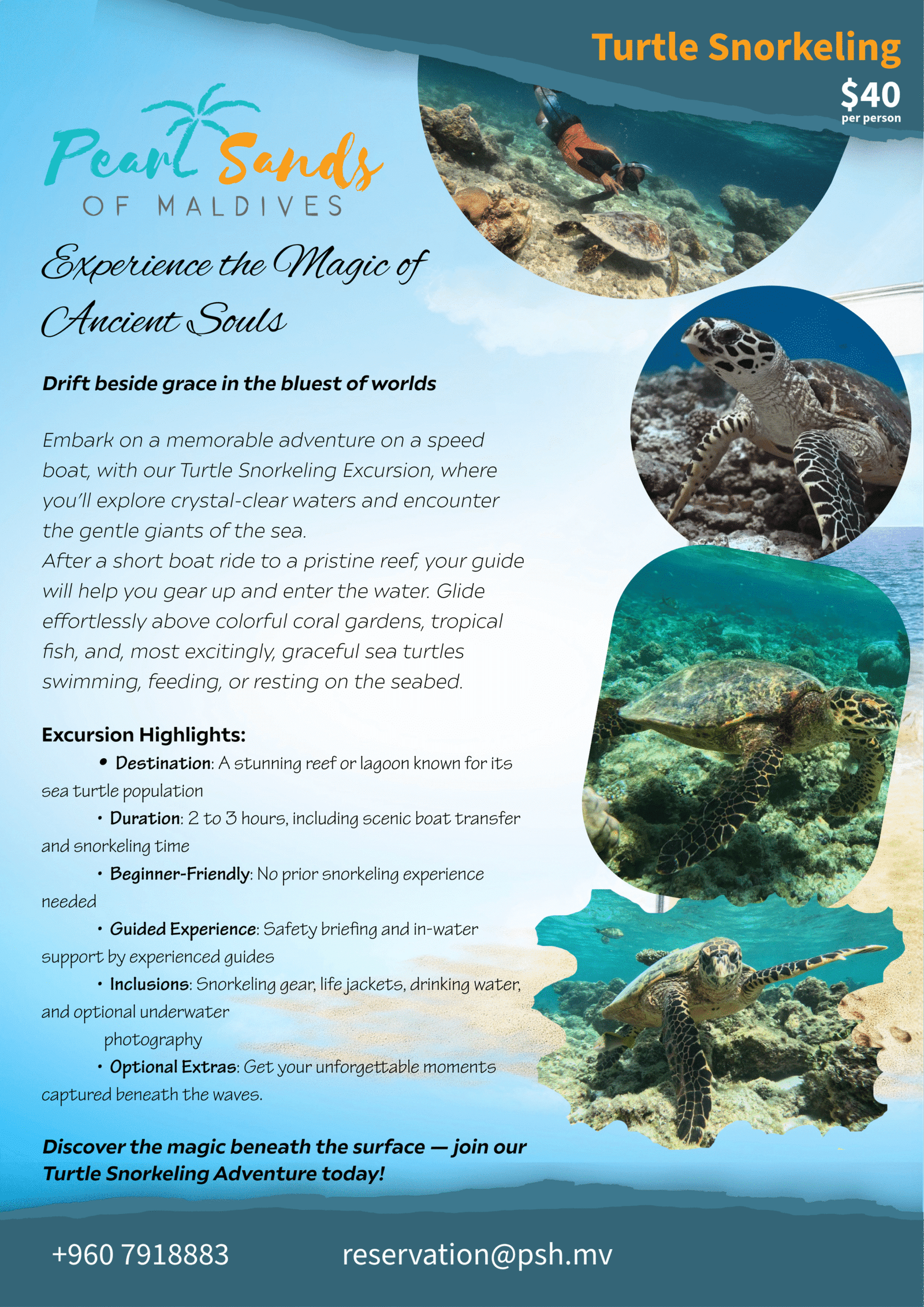 Excursions & Activities Embark on an aquatic adventure! Join our array of excursions, watersports and other engaging activities! Go for a diver to explore the wonders of the sea!Our expert teams ensure a safe and memorable experience for you! Lunch at Sea For 2 pax $180 Romantic Dinner For 2 pax $180 Sunset Hugs High Tea For 2 pax $100 Bonfire $40 Romantic Bed Decor $40 Turtle Snorkeling Per Person $40 Fish Factory Snorkeling Per Person $100 Nurse Shark Snorkeling Per Person $150 Dolphin Excursion Per Person $50 Crab Hunting Excursion Per Person $40 Sand Bank Excursion Per Person $100 Coral Garden Snorkeling Per Person $100 Sunset Fishing Per Person $75 Male’ excursion Per Person $60 Lobster Picnic Excursion Per Person $129 Parasailing 15 minutes flight Per Person $99 Funtube 10 minutes Per Person $25 Jet Ski 30 minutes Per Person $60 Surfing 2 hours Per Person $60 Paddle Boarding 1 hour Per Person $25 Wakeboarding 15 minutes ride Per Person 30 minutes lessonPer Person $35 $60 Kayak 1 hours (single)Per Person 1 hour (double)2 pax $10 $15 Big Game Fishing 2 hoursPer Boat 4 hoursPer Boat $359 $659